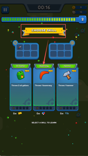 3、如何学习技能?倒计时“00:16”时进入“CHOOSE SKILL”界面,点击五星技能之一即可装备。