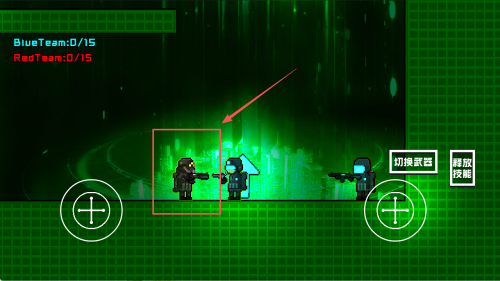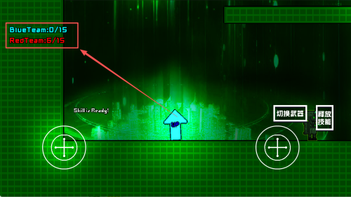4、如何查看比分?注意顶部“BlueTeam:0/15”“RedTeam:6/15”,击杀达15即可获胜。