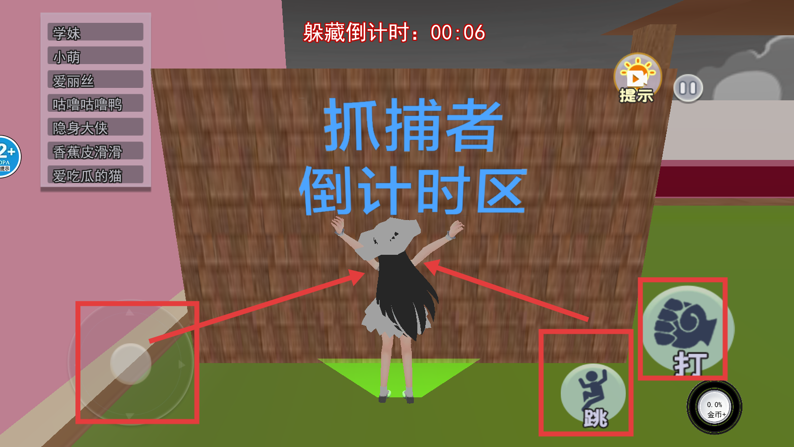2、在【躲藏倒计时】阶段,利用左侧摇杆移动角色,借助右侧【跳】【打】按钮,找好位置准备躲藏。
