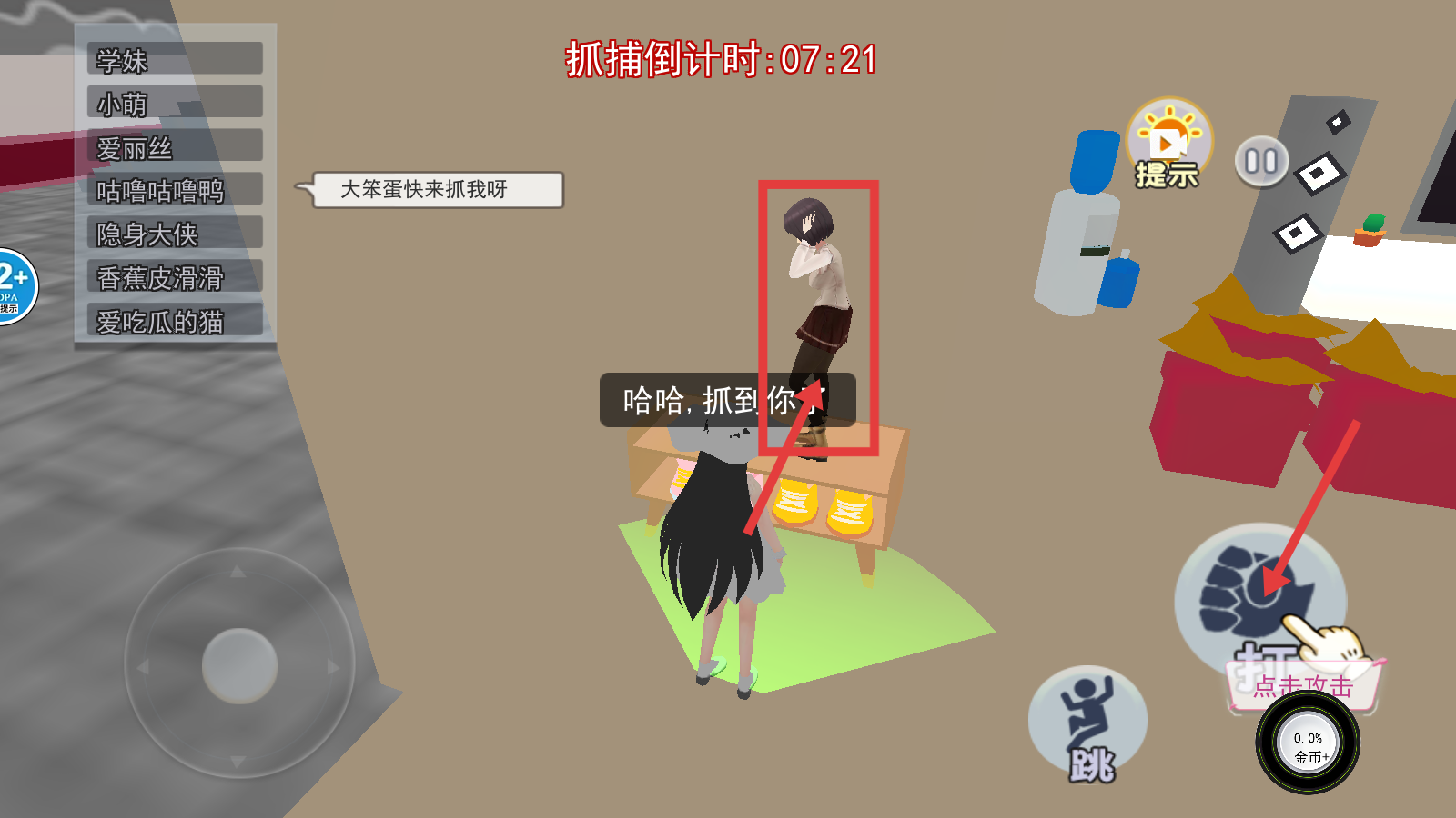 3、抓捕阶段,看到目标角色后,点击右侧【打】按钮,就能尝试抓捕对方,推进游戏进程。