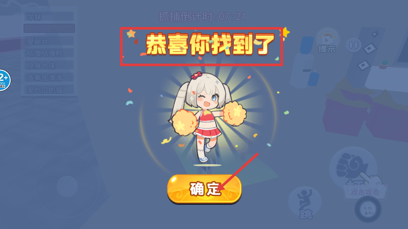 4、成功找到目标后,界面会显示【恭喜你找到了】,点击下方【确定】按钮,可确认此次成功并继续游戏。