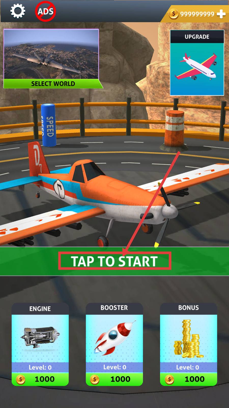 1、点击【TAP-TO-START】按钮启动游戏,可先查看【ENGINE】【BOOSTER】【BONUS】等升级选项,用金币强化飞机属性。