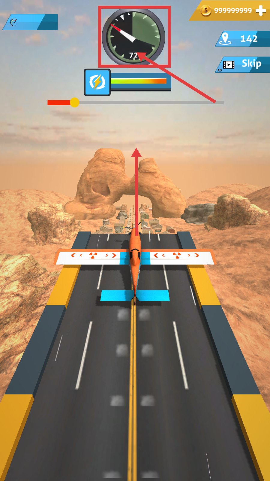 2、开始后关注上方仪表盘数值,控制飞机沿跑道加速,准备飞越前方地形。