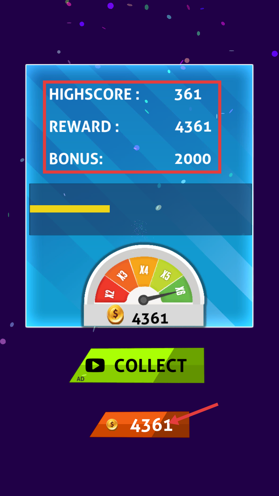 4、关卡结束后,界面会显示【HIGHSCORE】【REWARD】等数据,点击下方带金币的按钮可领取奖励,积累资源用于后续飞机升级。
