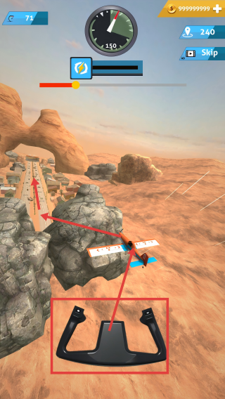 3、飞行过程中,通过下方操纵杆调整飞机方向,躲避岩石等障碍物,朝着目标路径前进。