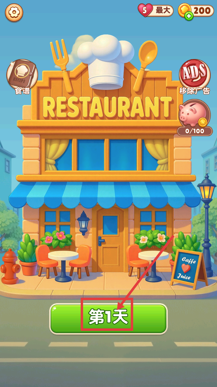 1、点击绿色【第1天】按钮,进入餐厅经营游戏,开启第一天的食材整理与烹饪挑战。