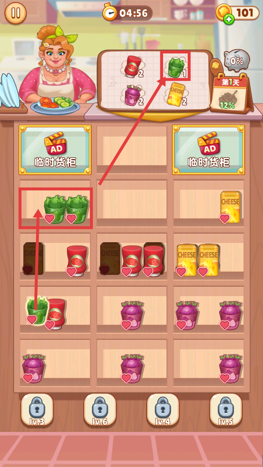 2、根据上方食材需求提示,将对应食材(如绿色蔬菜)移动到货柜中,为制作菜品准备原料。