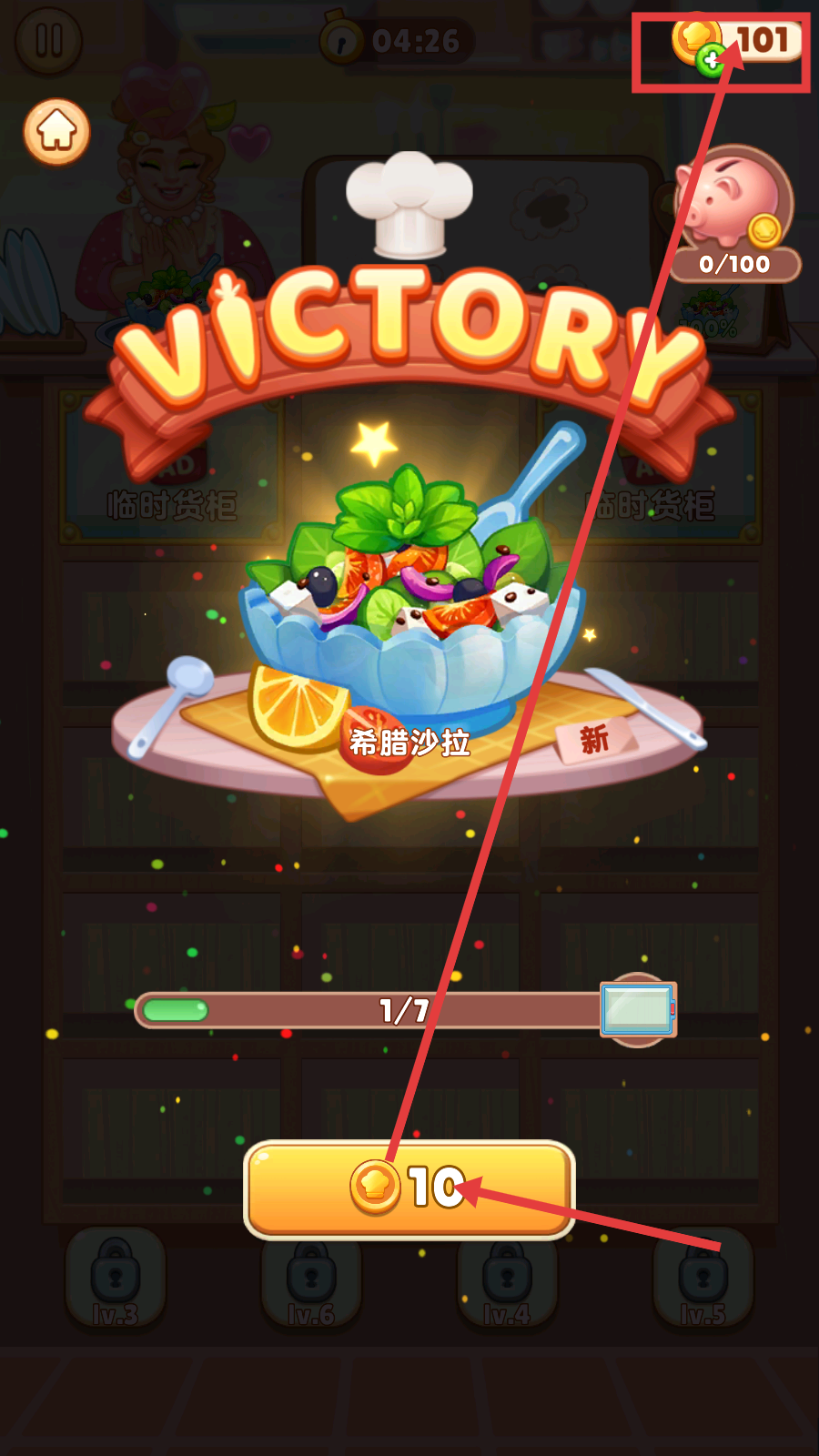 4、成功完成当天任务后,可获得金币奖励,还能解锁新菜谱【希腊沙拉】,继续后续餐厅经营。