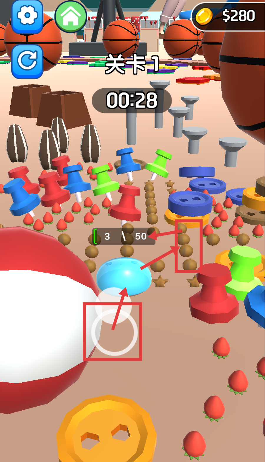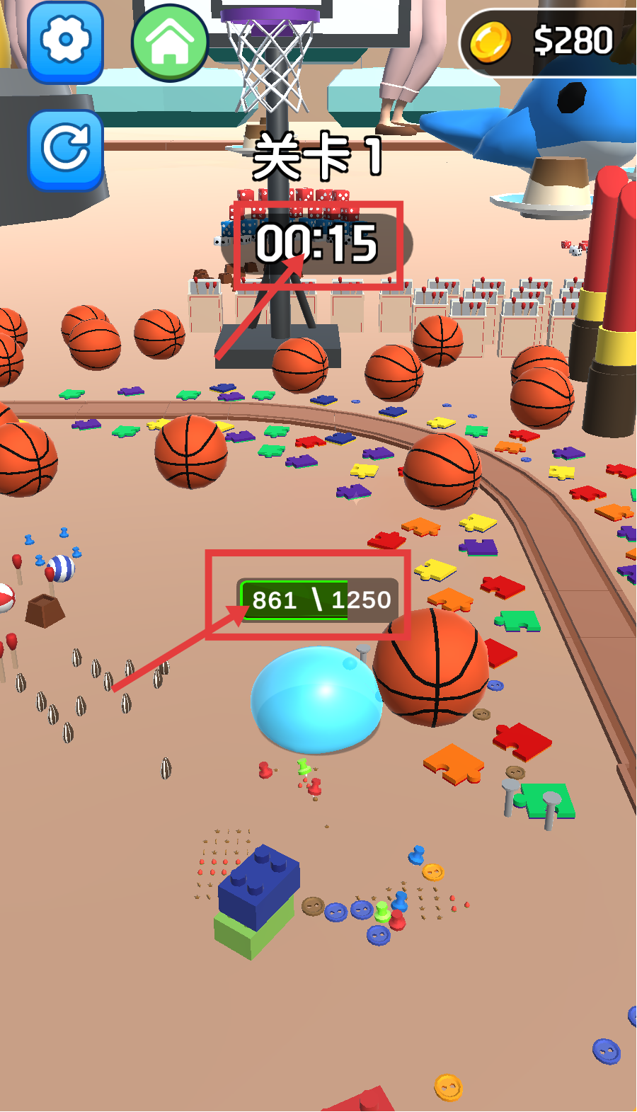 2、在关卡时间内,持续收集各类物品,提升收集进度至【1250】的数值,让史莱姆体型变的更大吞噬更多物品。