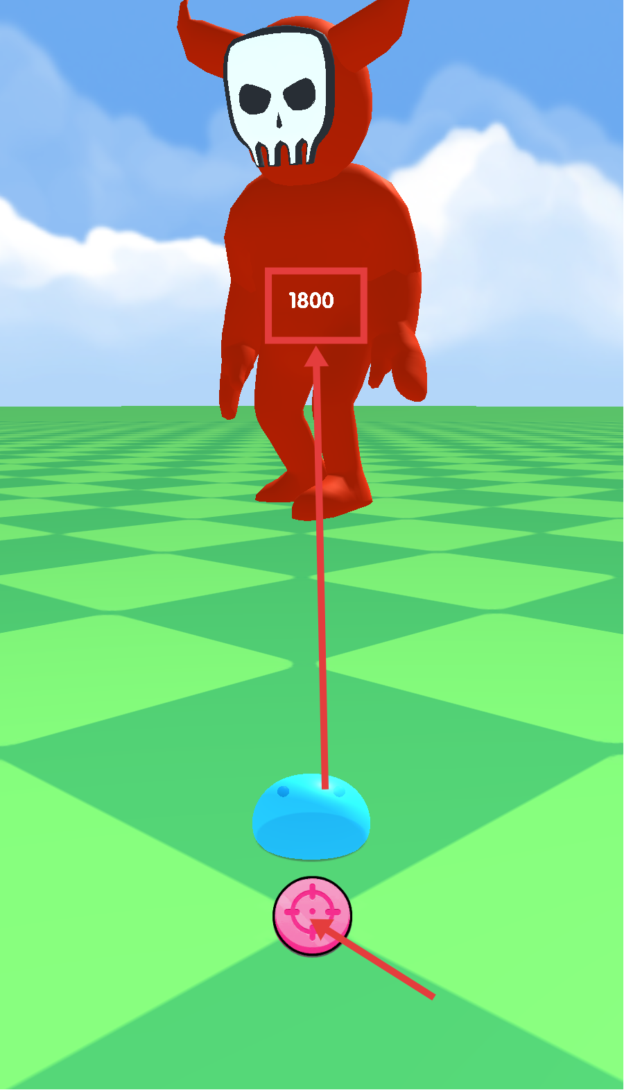 3、遇到带有【1800】数值的红色骷髅角色时,点击粉色瞄准按钮,操控蓝色史莱姆对其进行攻击。
