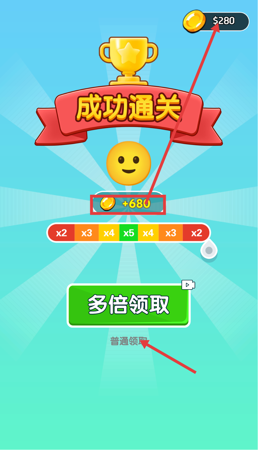 4、成功通关后,可获得【+680】金币奖励,选择【普通领取】或【多倍领取】来获取金币,积累资源用于后续关卡。