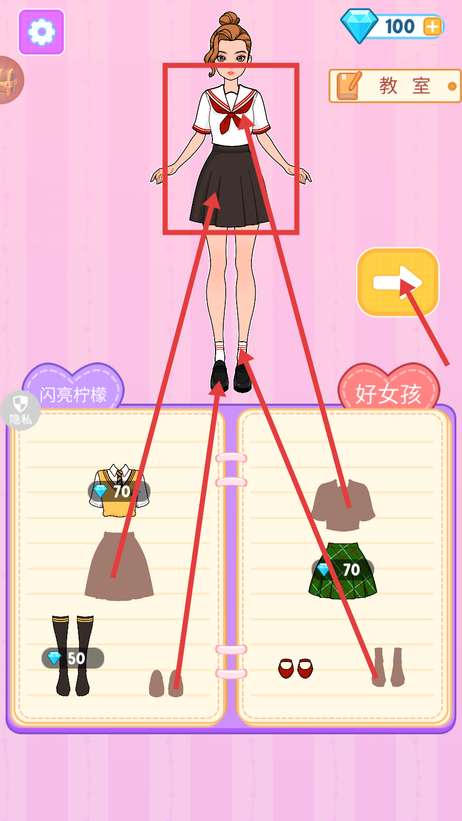 2、在装扮界面,为角色搭配适合【教室】场景的服饰,搭配完成后点击黄色箭头按钮。