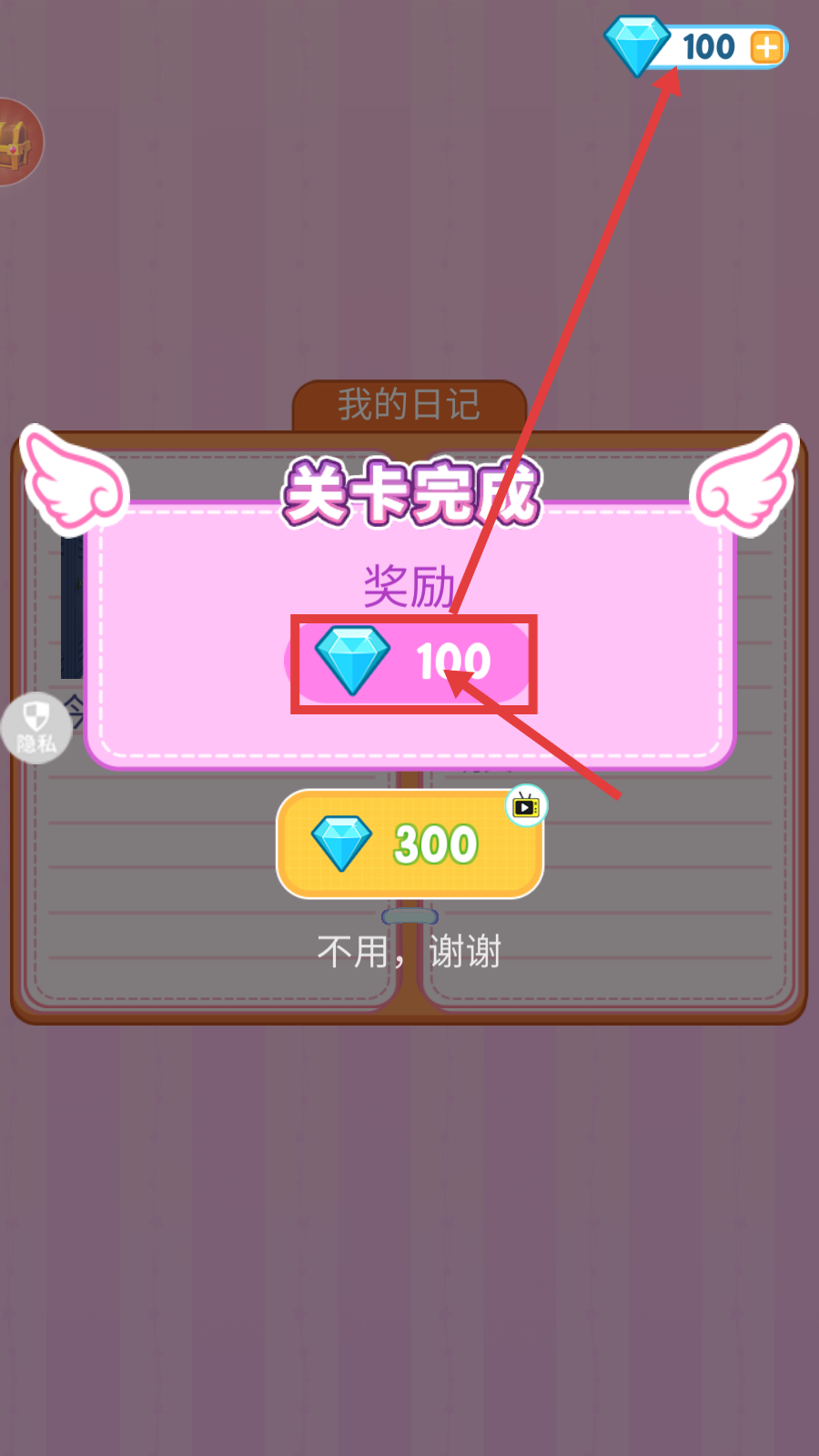 4、关卡完成后,可获得【钻石-100】的奖励,领取后能增加钻石数量,用于后续装扮等操作。
