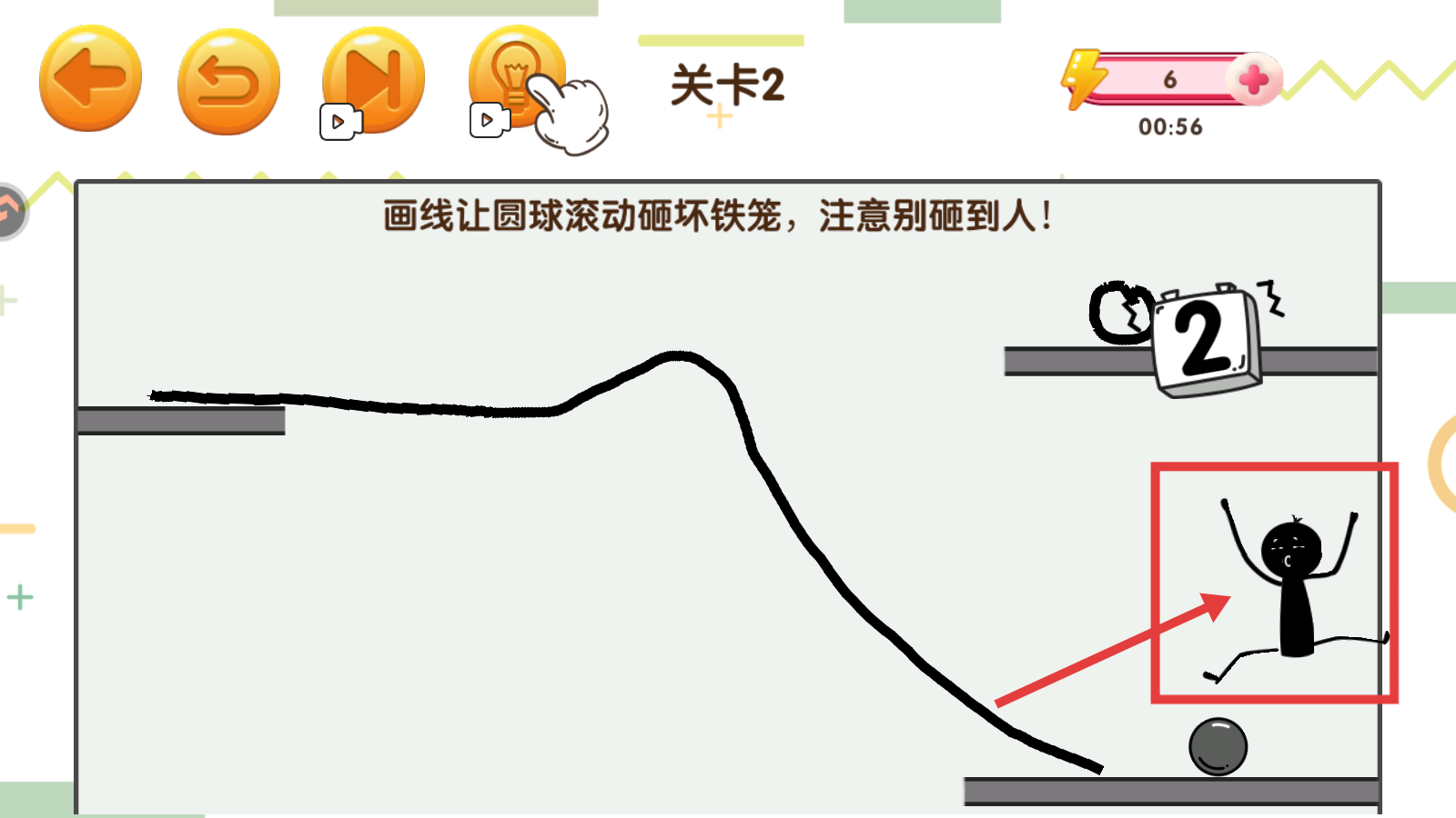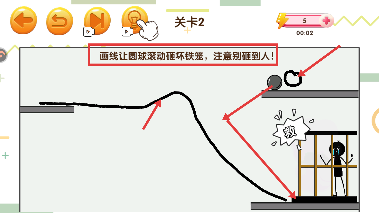 2、在【关卡2】中,按照提示【画线让圆球滚动砸坏铁笼,注意别砸到人!】,画出引导圆球滚动的线路。