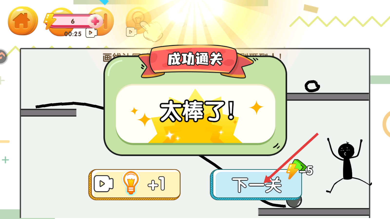 4、成功通关后,界面显示【成功通关-太棒了!】,点击【下一关】按钮,继续挑战后续画线解谜关卡。