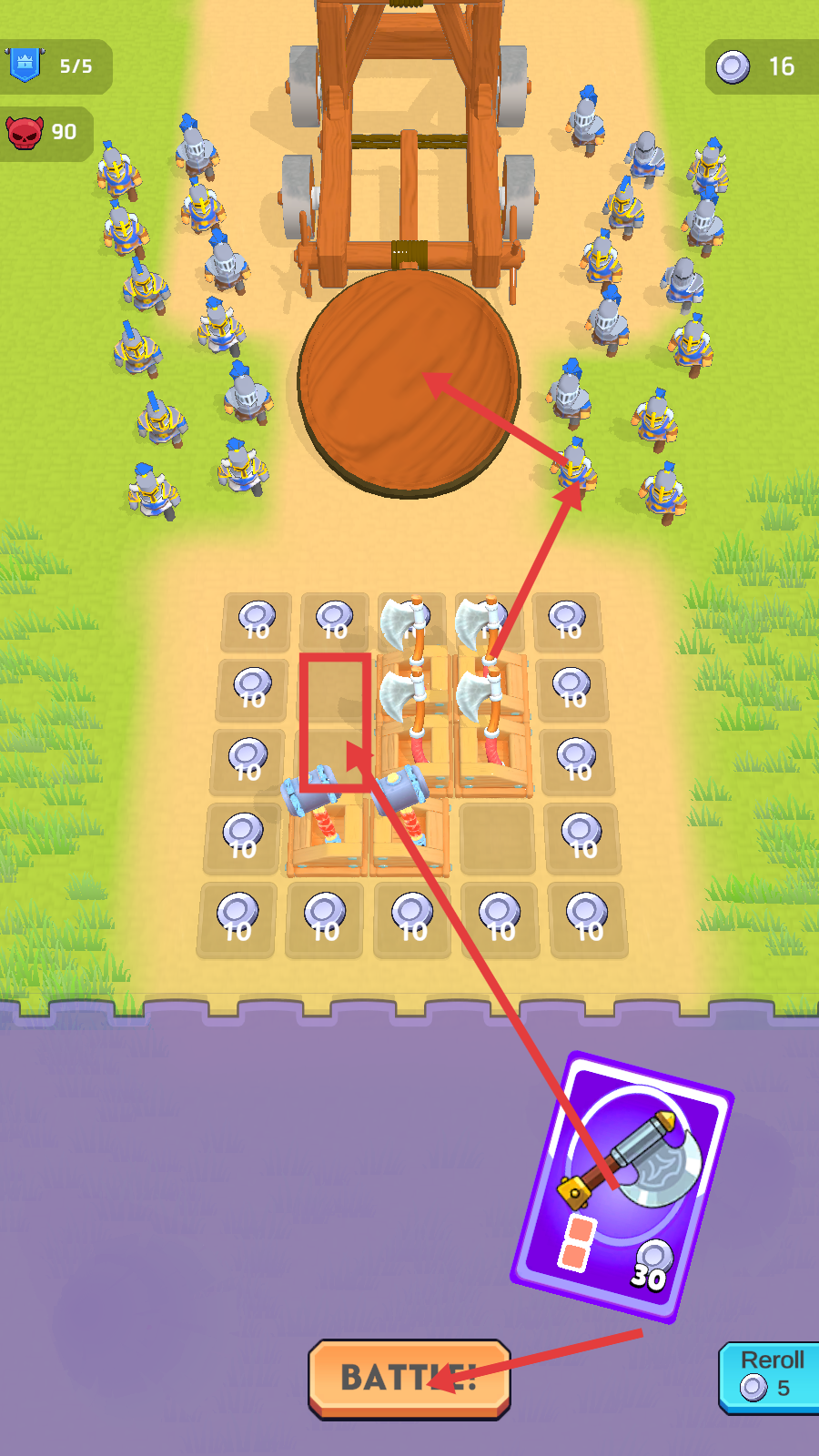 1、战斗前,用30资源部署【斧头】类武器到空位,搭配已有作战单位,准备好后点击【BATTLE!】开启战斗。