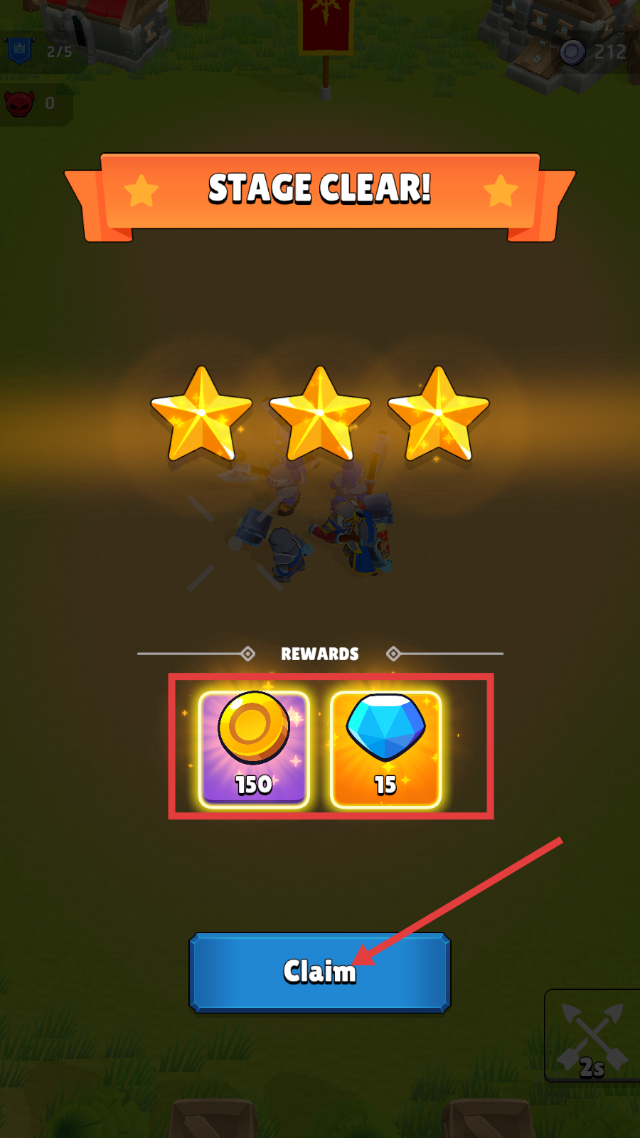 4、成功通关后,及时点击【Claim】按钮,领取150金币和15钻石的奖励,用于后续强化战力。