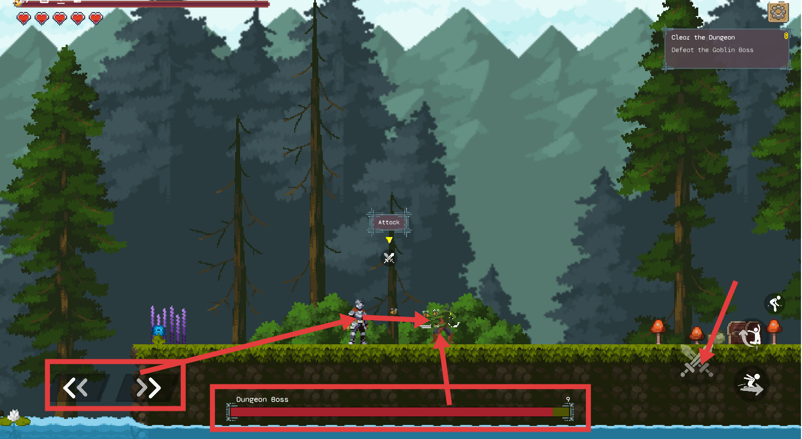 2、战斗时,利用左右移动按钮操控角色,点击攻击按钮对抗敌人,优先挑战【DungeonBoss】积累经验。