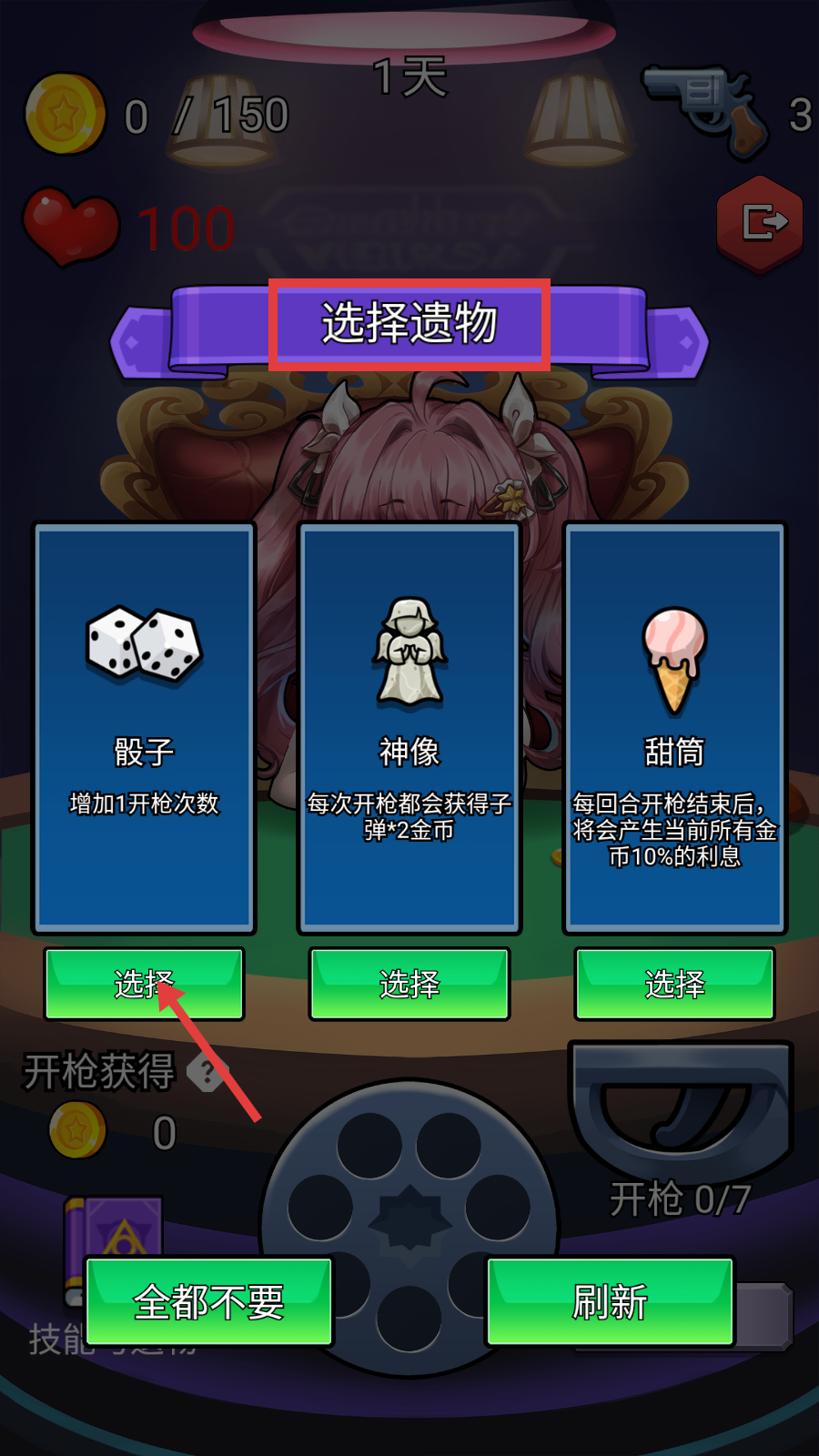 2、在【选择遗物】阶段,可选择【骰子-增加1开枪次数】,借助该遗物提升开枪次数,为获取金币创造条件。