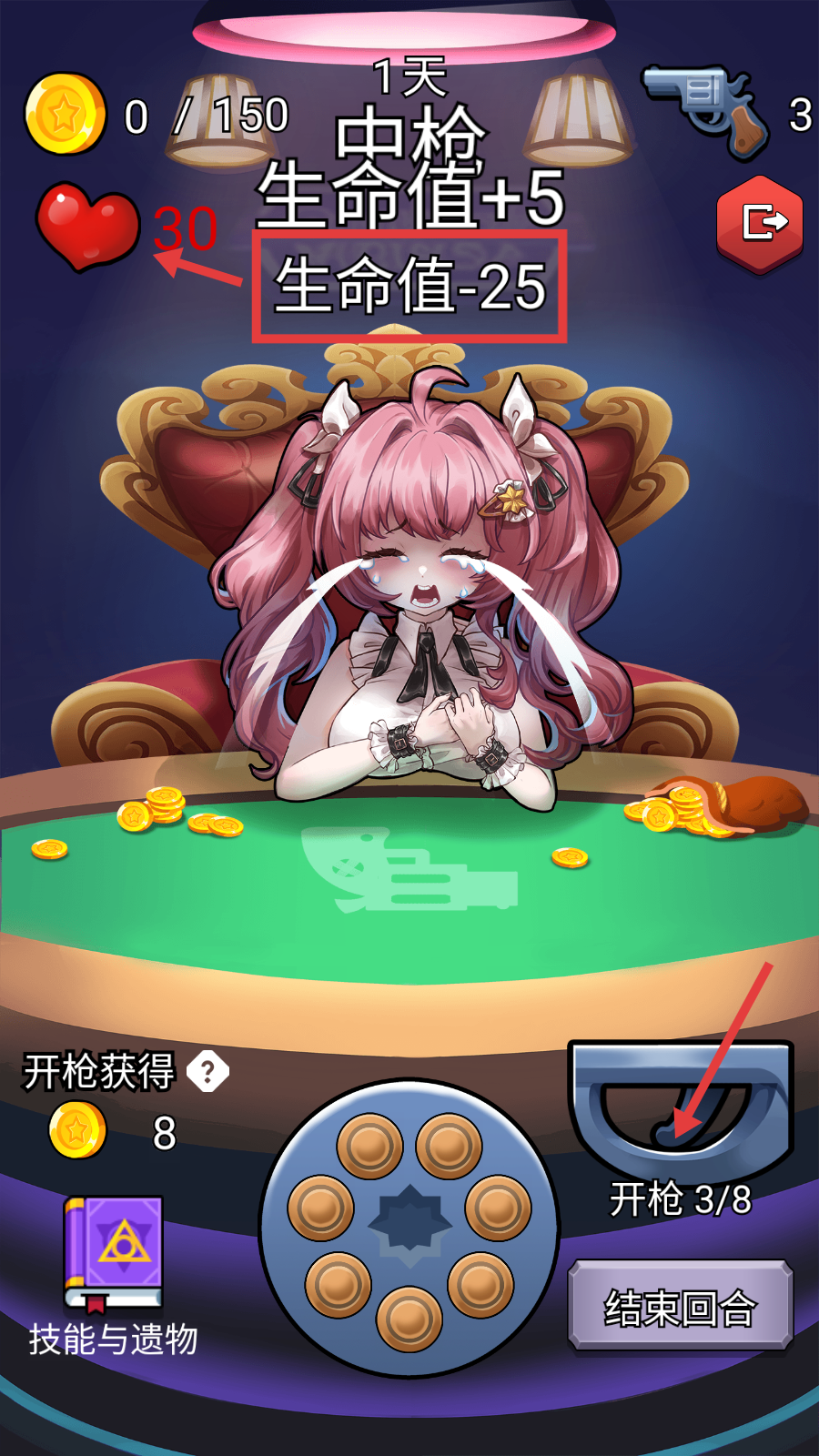 3、开枪过程中,注意生命值变化,若触发【生命值-25】,需合理把控开枪频率,同时利用开枪获取金币。