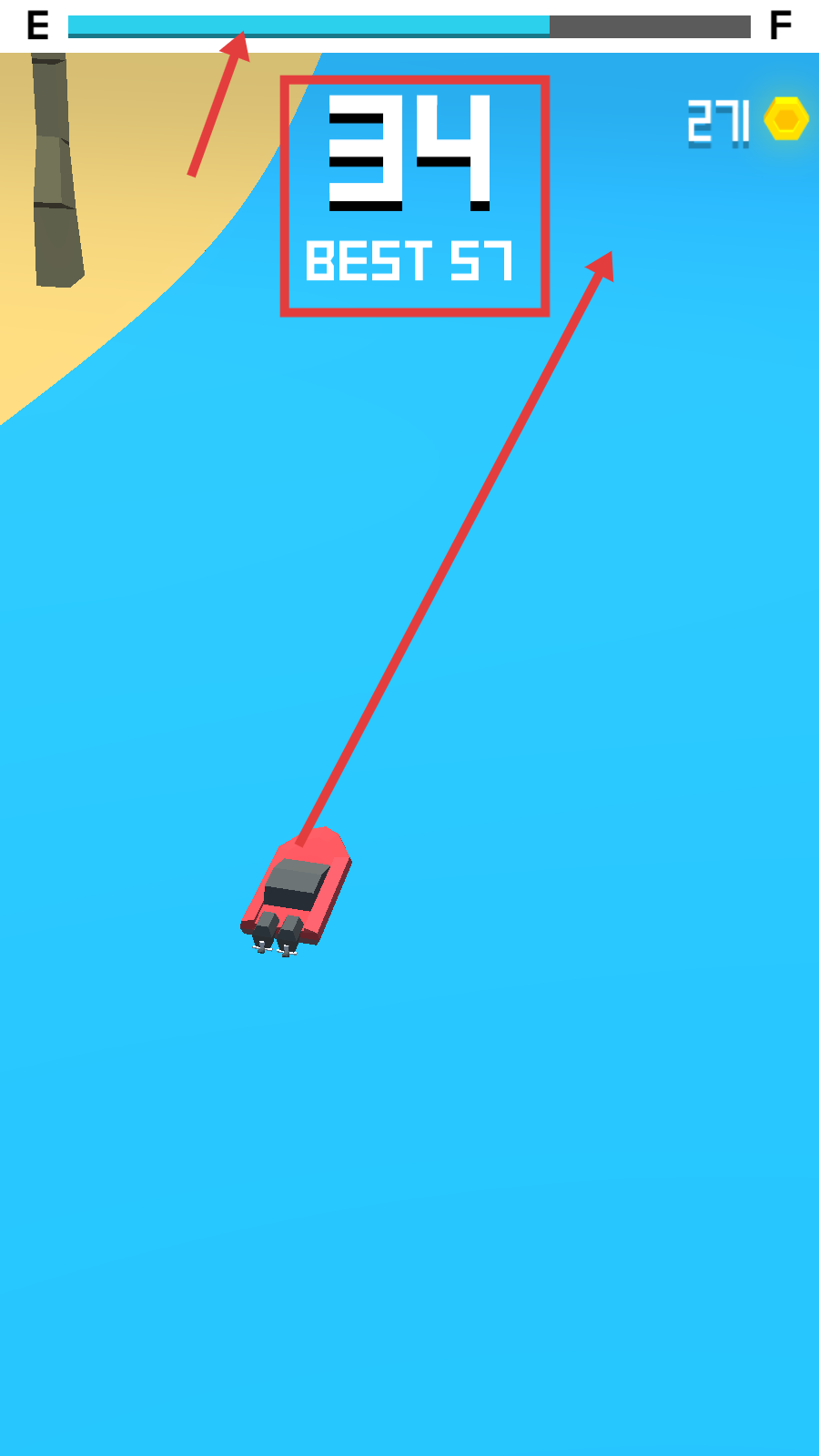 2、行驶中关注上方得分,当前得34要冲击【BEST-57】,同时留意顶部进度条,保持船只在水道内稳定前进。