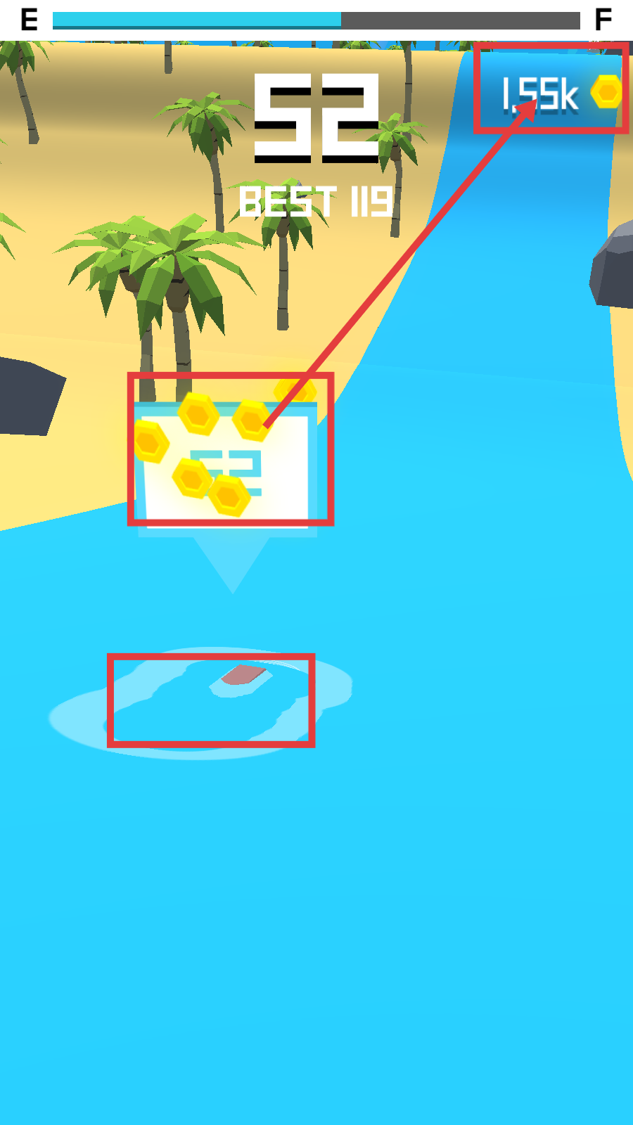 3、行驶过程中要收集黄色金币,积累到【1.55k】,但需注意避免船只损坏(若出现水面残骸说明行驶不当),安全行驶同时拿金币。