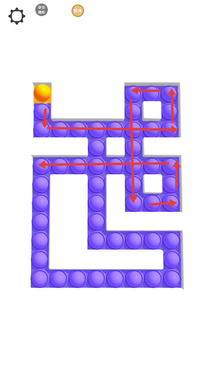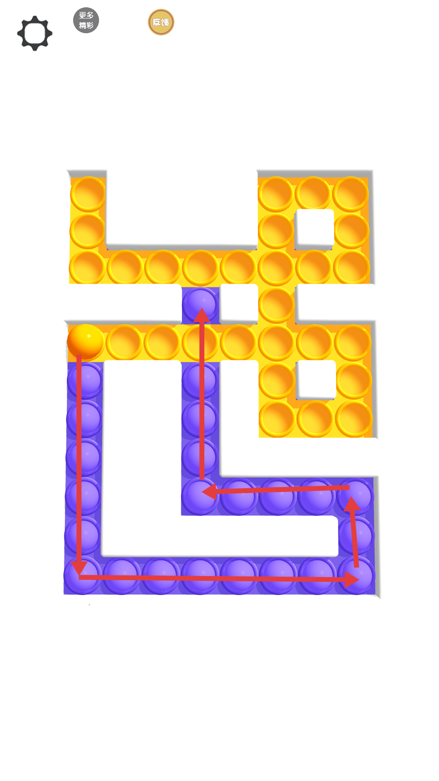 2、黄色区域覆盖后,黄色小球移至左侧,按照红色箭头路径,继续按压剩余的紫色泡泡,完成该区域的覆盖。
