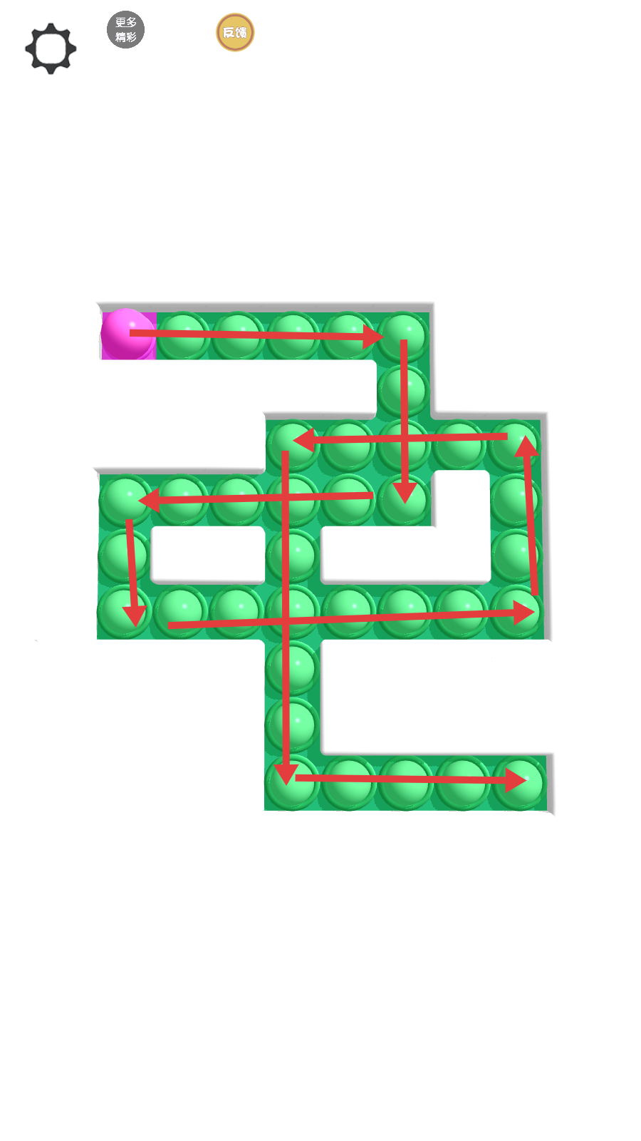 3、粉色小球从左侧出发,沿着红色箭头路径,在绿色泡泡区域移动,依次按压绿色泡泡,逐步拓展覆盖范围。