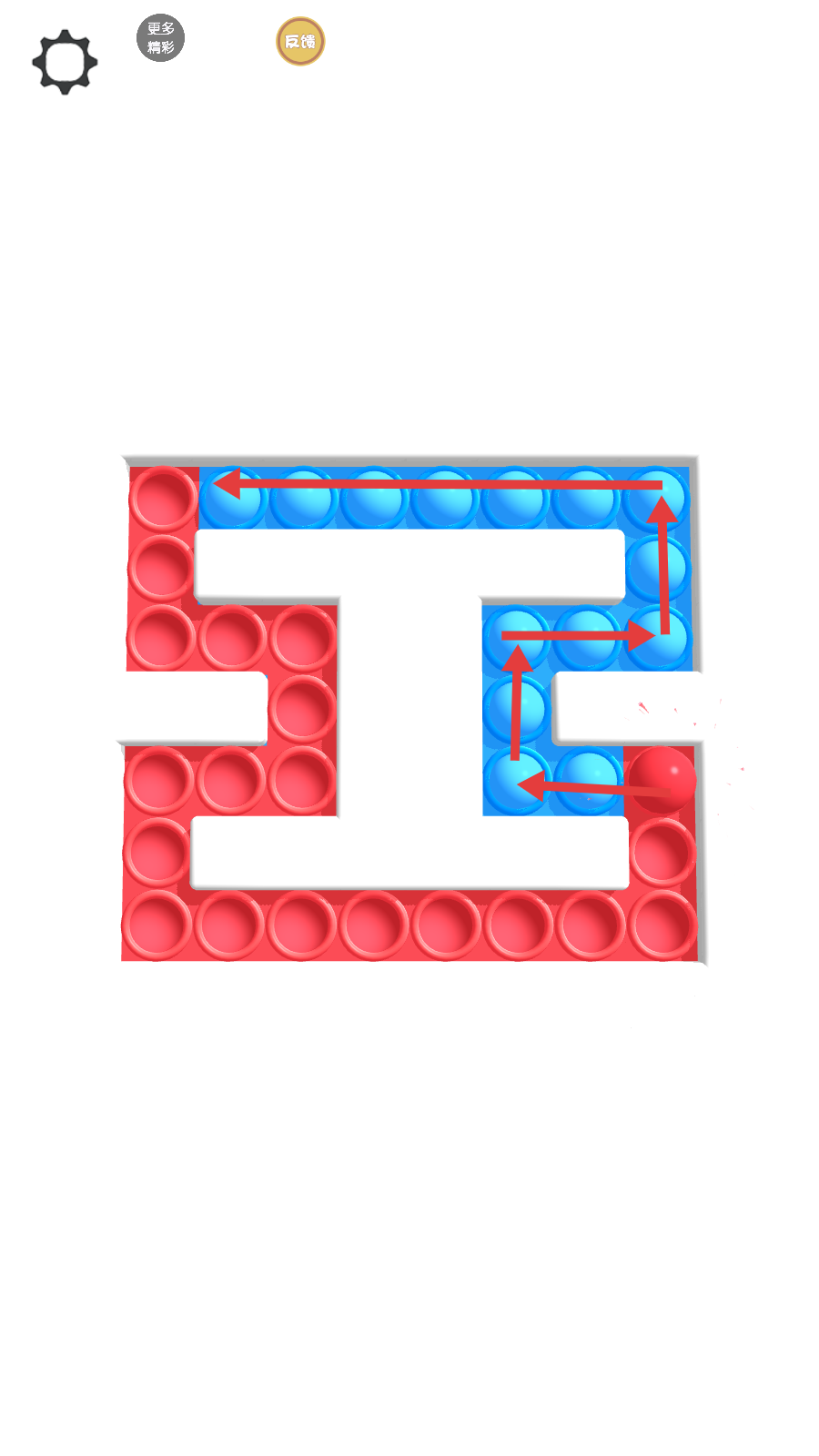 4、红色小球从右侧出发,按照红色箭头路径,在蓝色泡泡区域移动,依次按压蓝色泡泡,完成蓝色区域的覆盖。