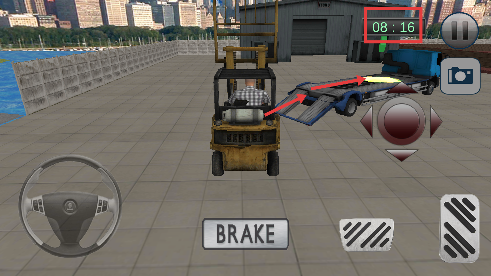 3、在时间(如【08:16】)内,操控叉车沿着蓝色卡车的坡道,精准驶向卡车上的黄色目标区域,保证移动路径的准确性。