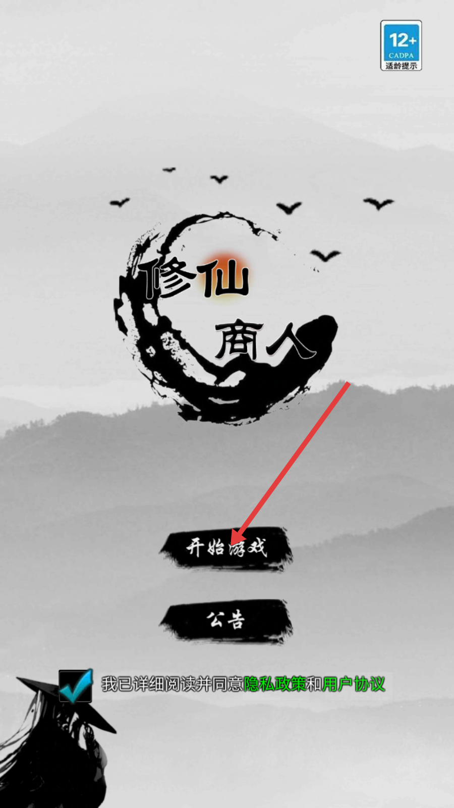 1、勾选同意隐私政策和用户协议后,点击【开始游戏】,进入《修仙商人》的修仙世界,开启凡界的修炼之旅。