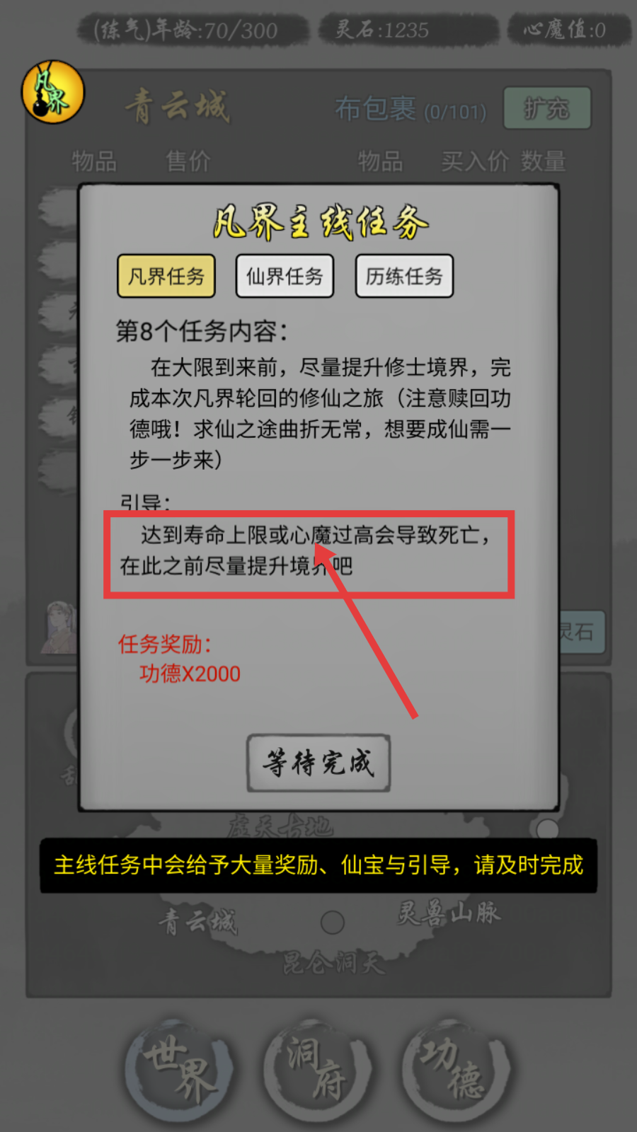 2、关注【凡界主线任务】,任务会给予大量奖励与引导;同时要注意,寿命上限或心魔过高会导致死亡,需及时提升境界。