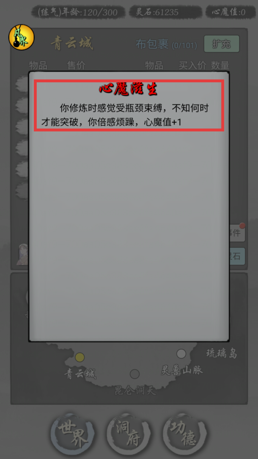 3、修炼时若遇瓶颈,会滋生心魔,导致【心魔值+1】,心魔值过高会影响生存,需留意这种情况的出现。