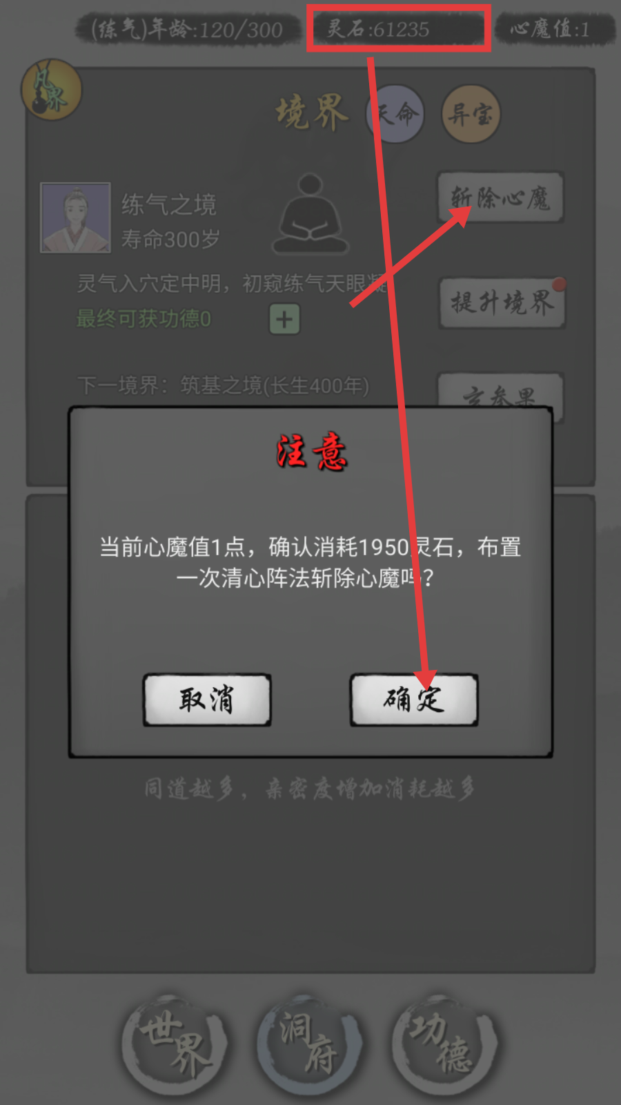 4、当产生心魔后,可点击【斩除心魔】,消耗灵石(如消耗1950灵石)布置清心阵法,确认后点击【确定】来消除心魔。
