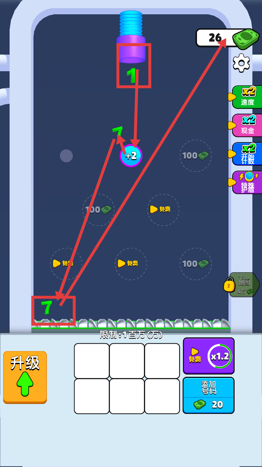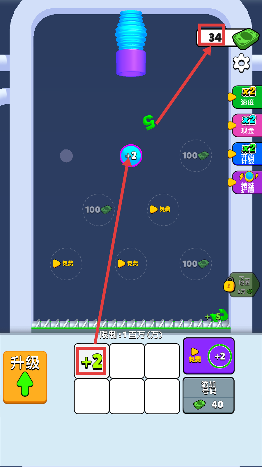 1、操控紫色部件下落,借助【+2】增益效果,让数字部件碰撞底部,快速获取右上角显示的资源。