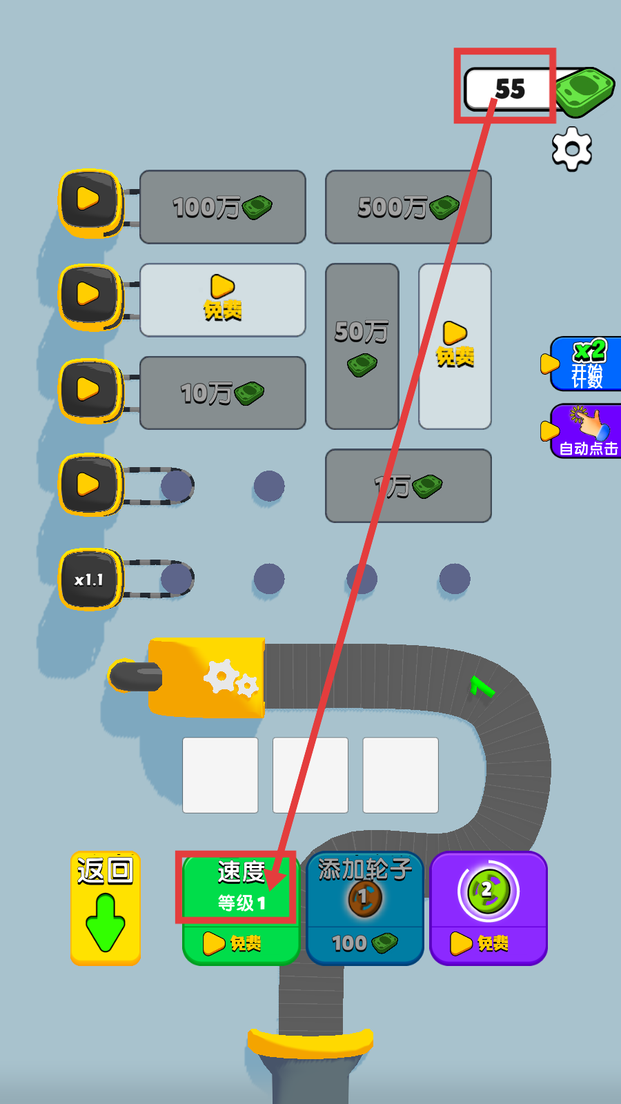 4、进入地图界面后,优先选择【速度-等级1】的免费升级选项,提升游戏内操作与产出的整体速度。