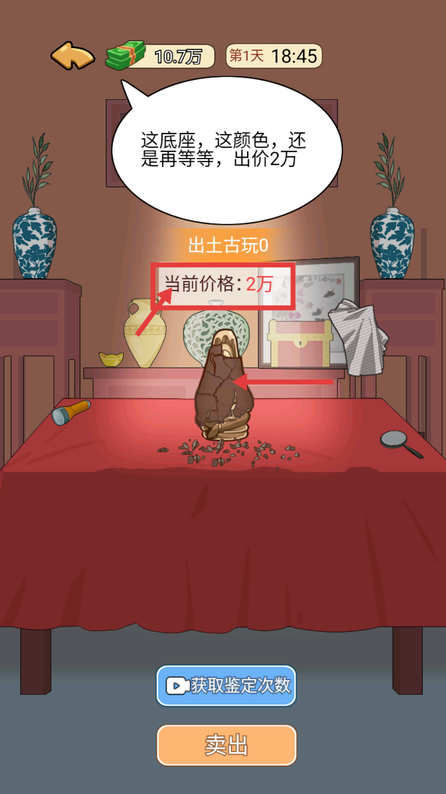 1、发现【出土古玩】时,即使显示成交价1万,也先点击【去鉴定】,挖掘古玩潜在价值。