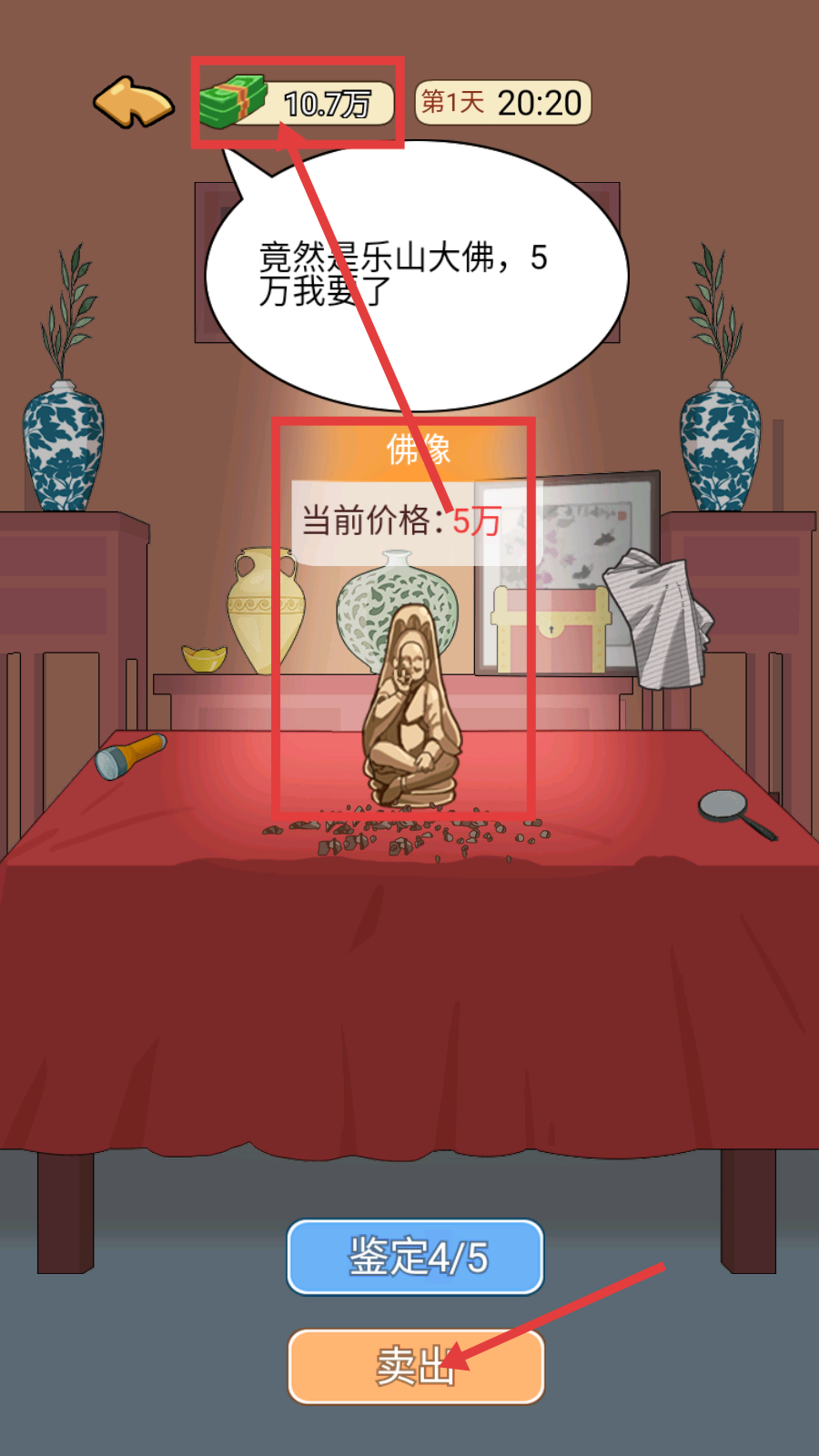 4、当古玩被鉴定为【乐山大佛】且价格达5万时,点击【卖出】,获取最大收益。