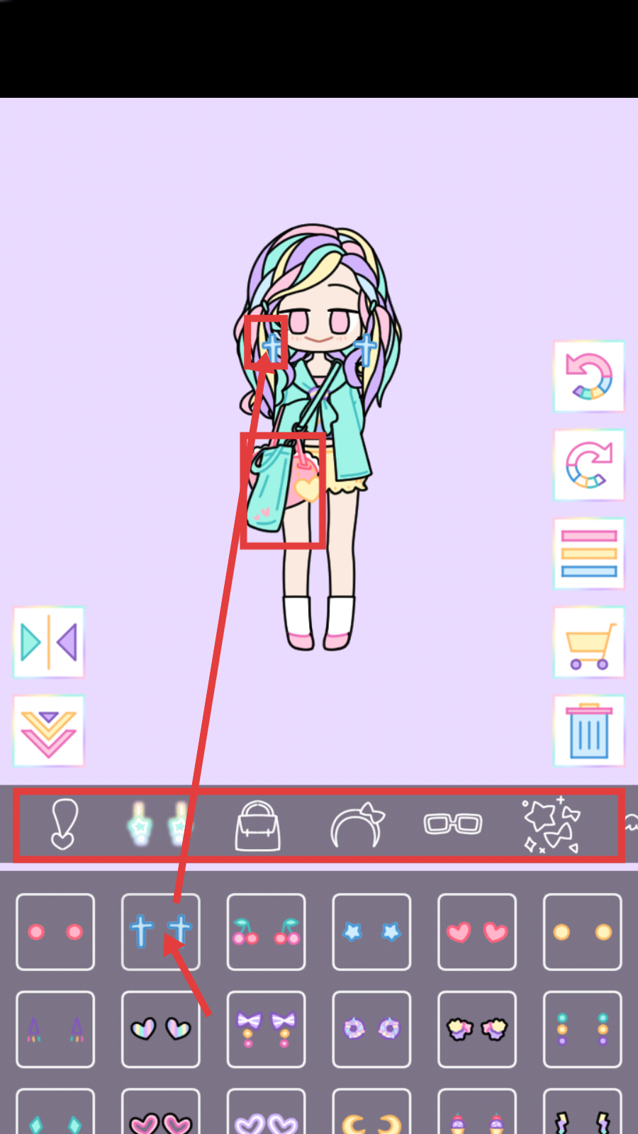 3、为角色挑选配饰,像蓝色十字耳环、爱心图案包包等,让整体造型更丰富。
