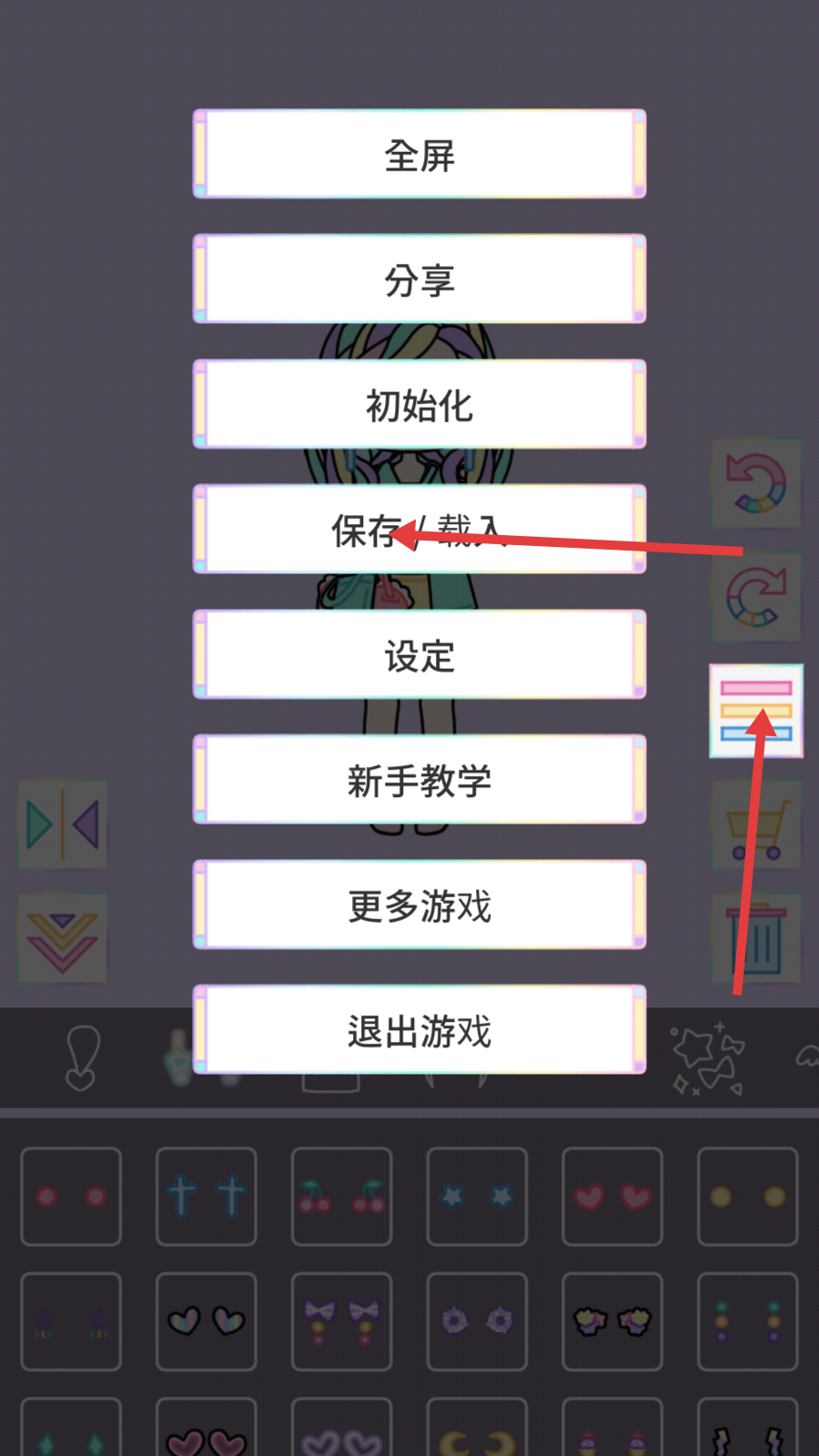 4、装扮好后,点击右侧菜单按钮,选择【保存/载入】,可留存设计的角色形象。