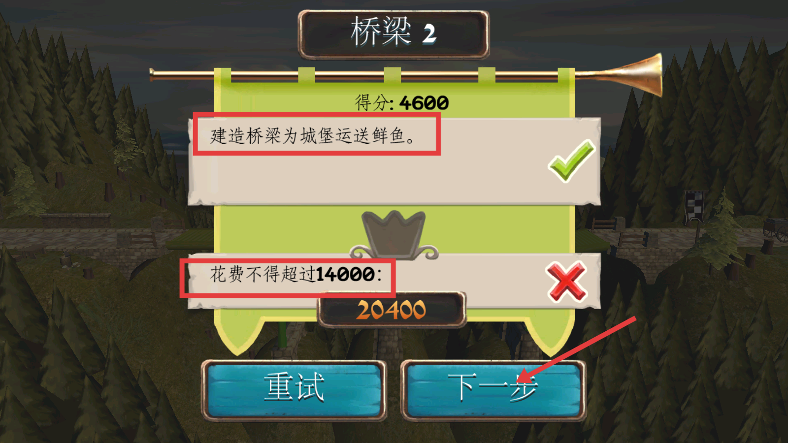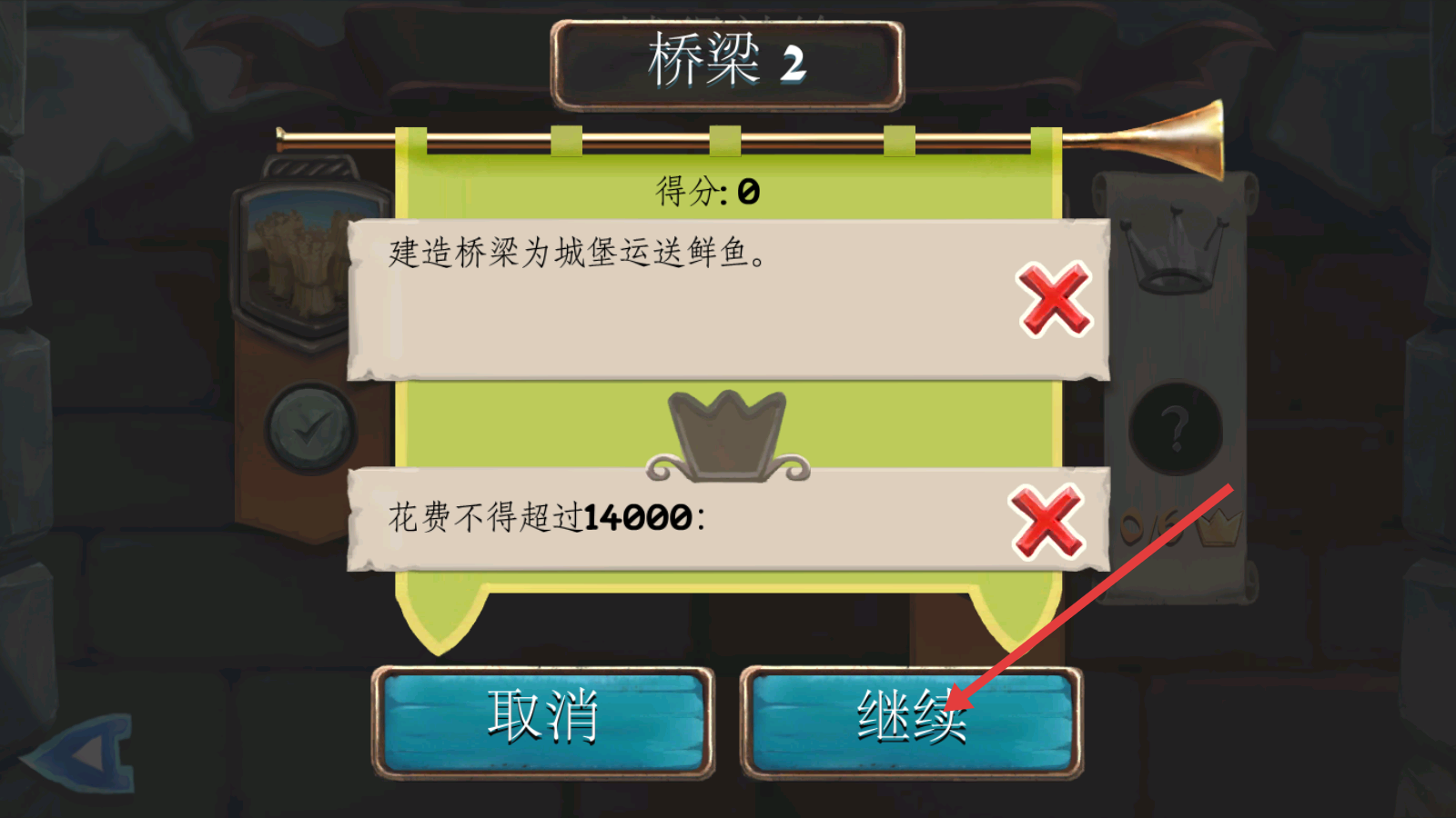 1、进入【桥梁2】关卡,明确任务为建造桥梁为城堡运送鲜鱼且花费不得超过14000,点击【继续】开始建造。