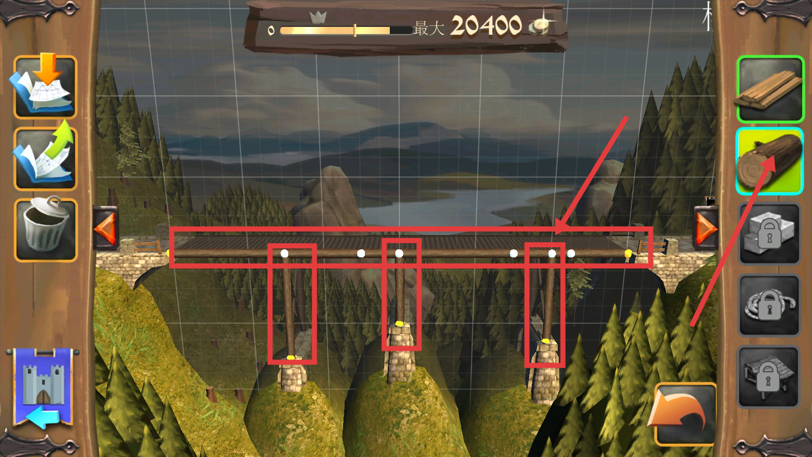 2、在建造界面,选用木材等材料,规划桥梁的支撑柱与桥面结构,确保桥梁具备足够承重能力。