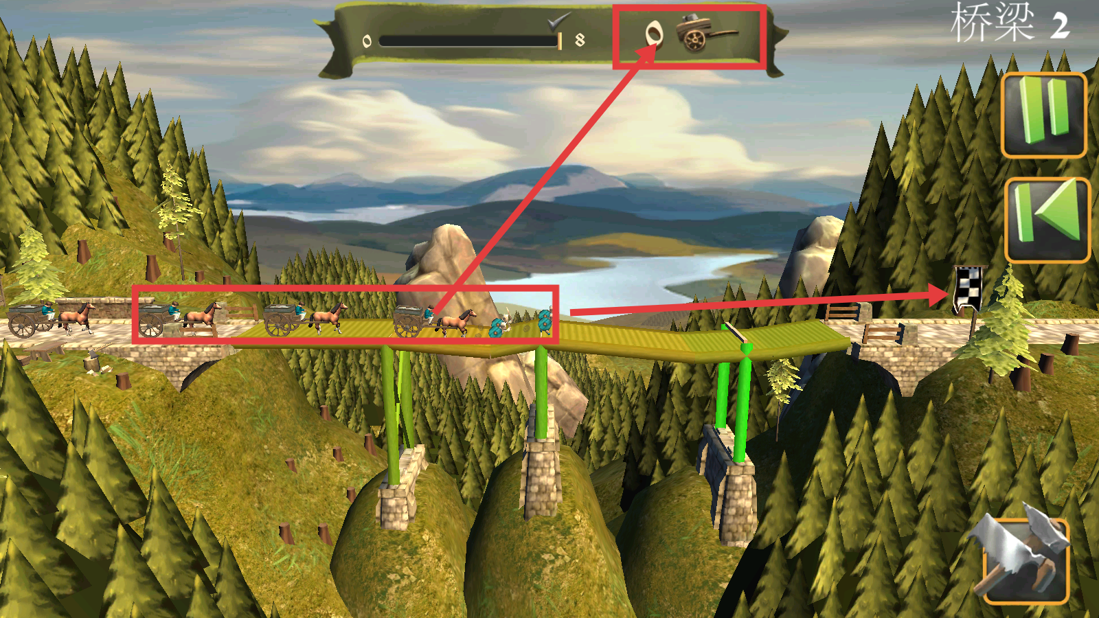 3、桥梁建造完成后,启动测试,观察马车能否顺利通过桥梁,成功运输鲜鱼至目标地点。