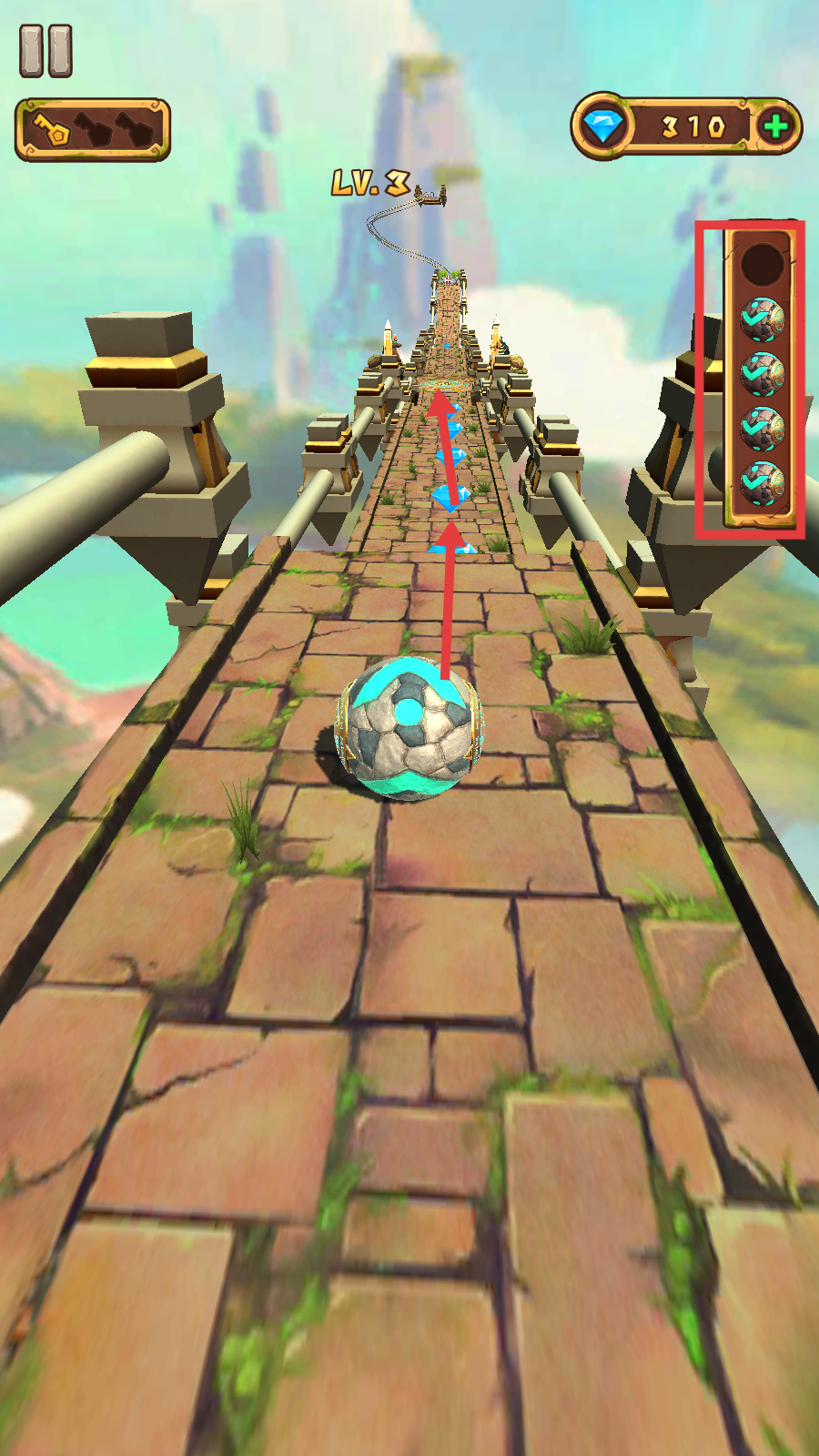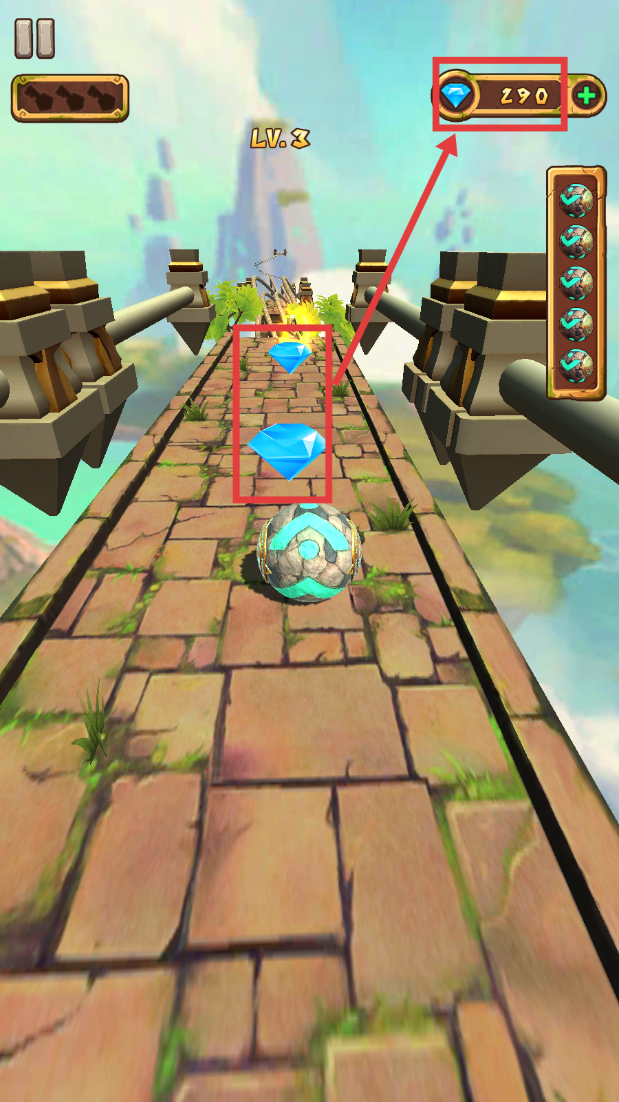 2、在轨道上收集蓝色钻石,每次收集成功后,右上角的钻石数量会相应增加,积累资源。