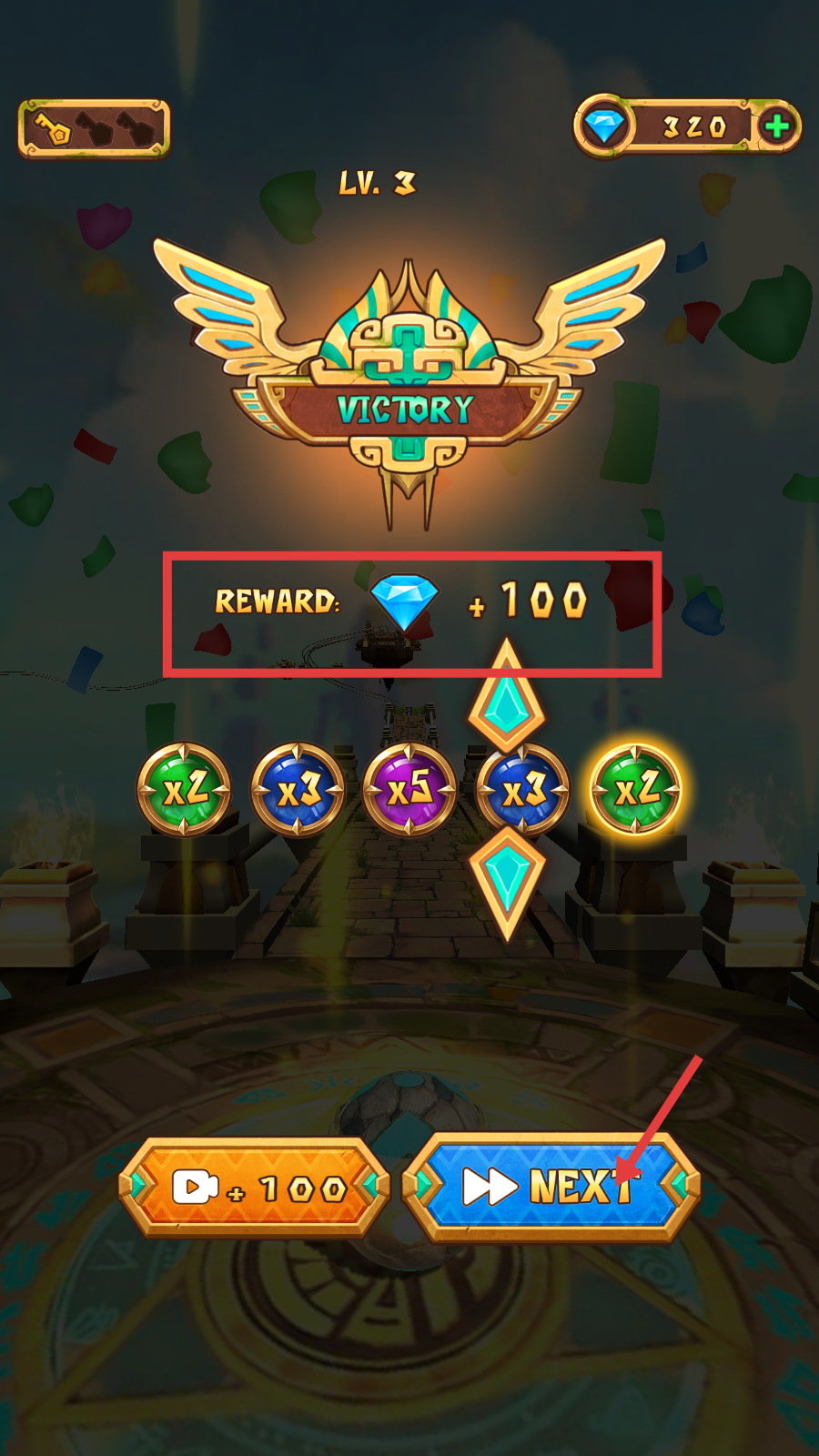 4、成功通关后,可获得【REWARD:钻石+100】的奖励,点击蓝色【NEXT】按钮进入下一关。