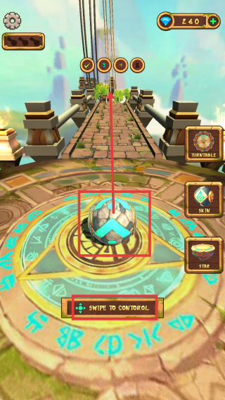 1、开始时按照【SWIPETOCONTOROL】提示,滑动屏幕控制球体沿桥梁轨道向前移动。