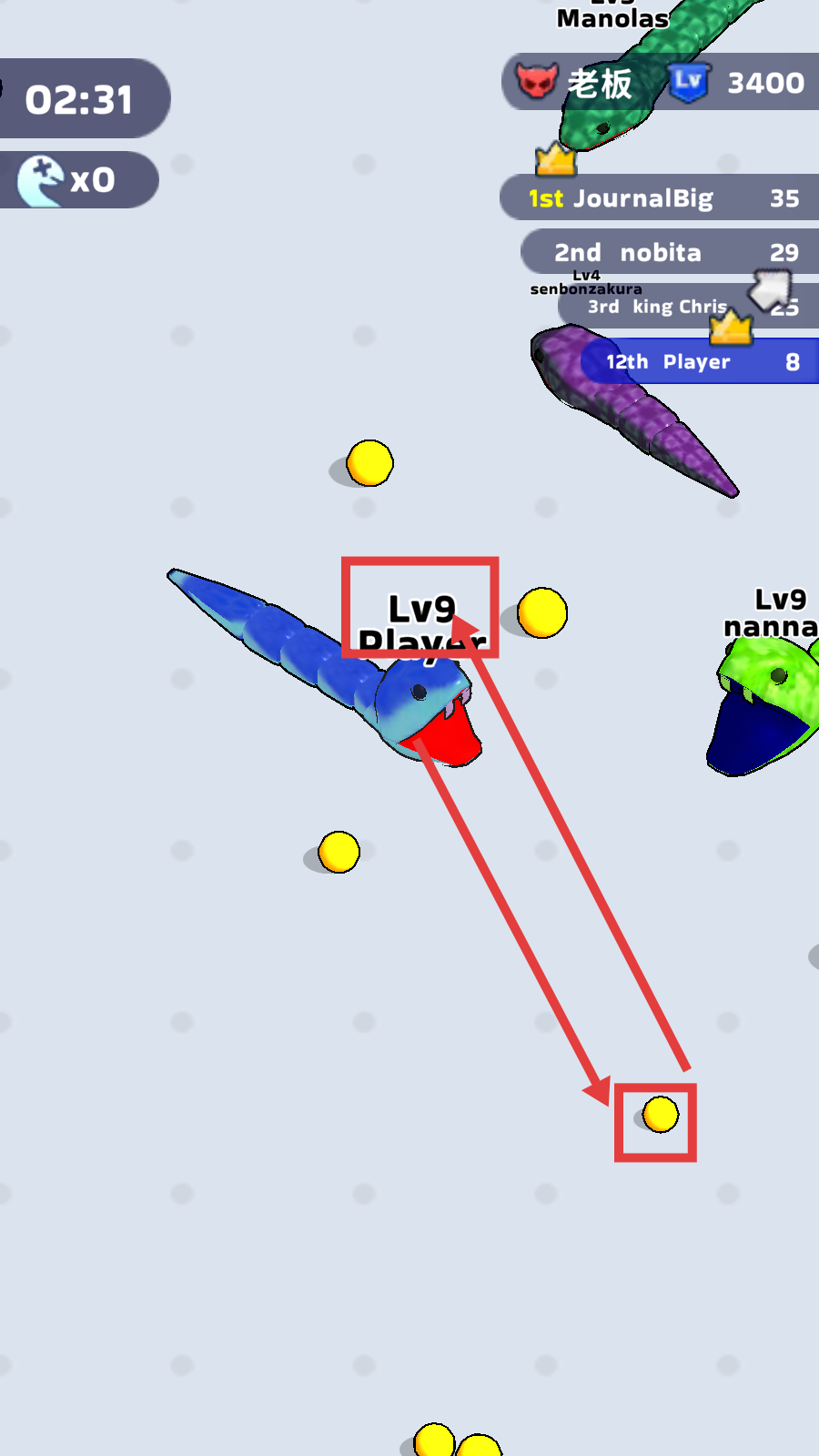 2、操控蛇移动,收集场景中的黄色小球,快速提升蛇的等级(如从Lv1升至Lv9)。