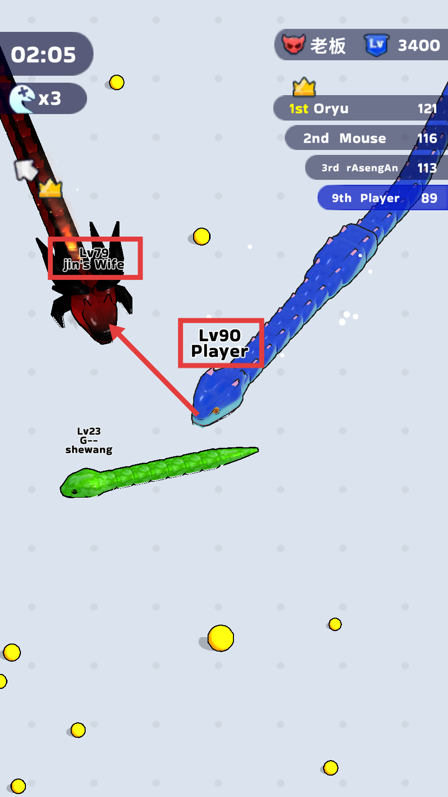 3、等级提升后(如到Lv90),灵活操控长蛇,吞噬低等级对手,避开高等级对手,同时争夺资源继续成长。