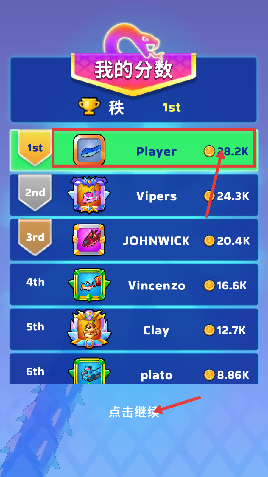 4、游戏结束后,查看【我的分数】排名,若获第1名,点击【点击继续】开启下一局。