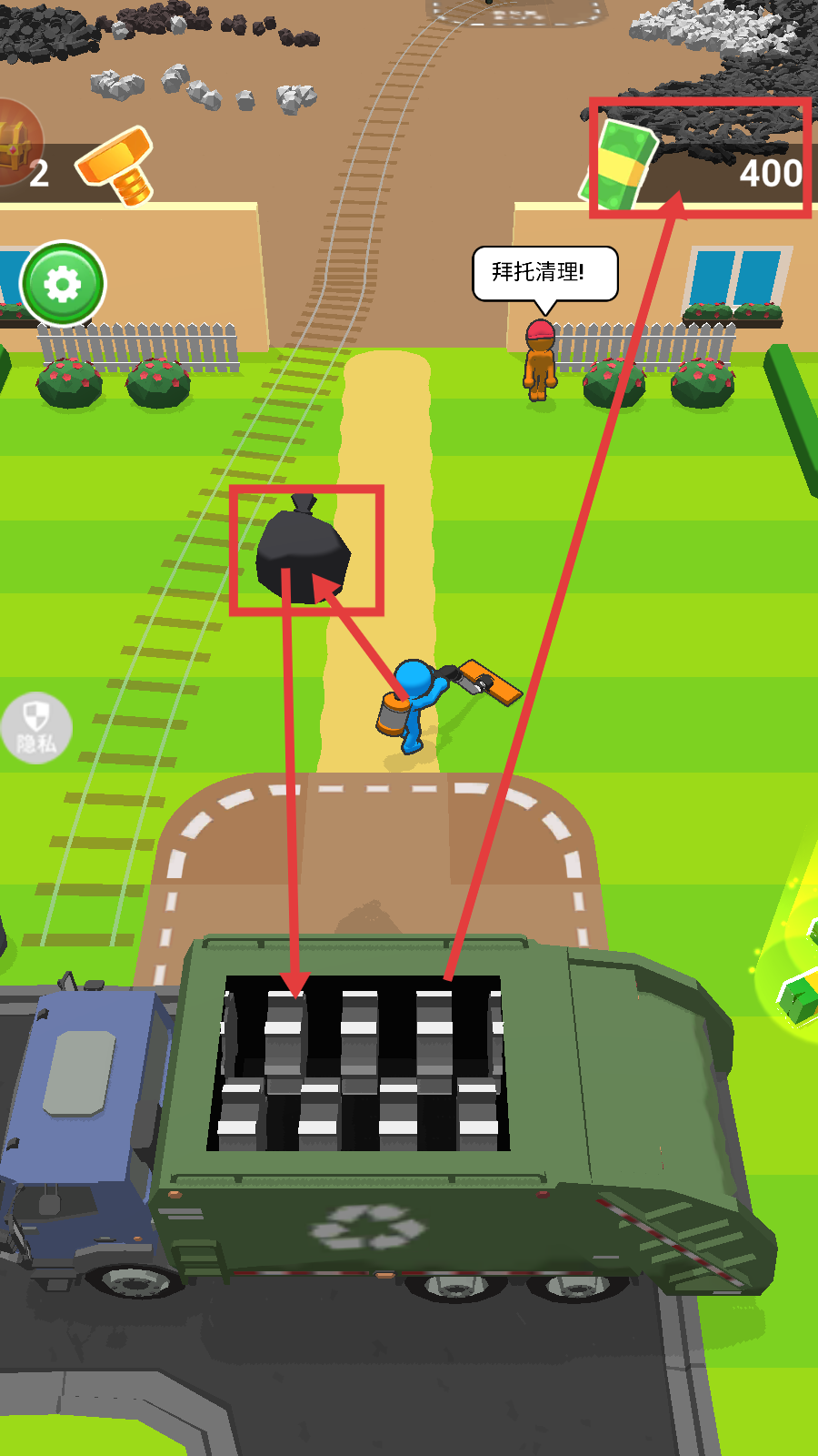 3、将清理好的垃圾装袋,搬运到垃圾车中,完成后可获取金币,积累资源。